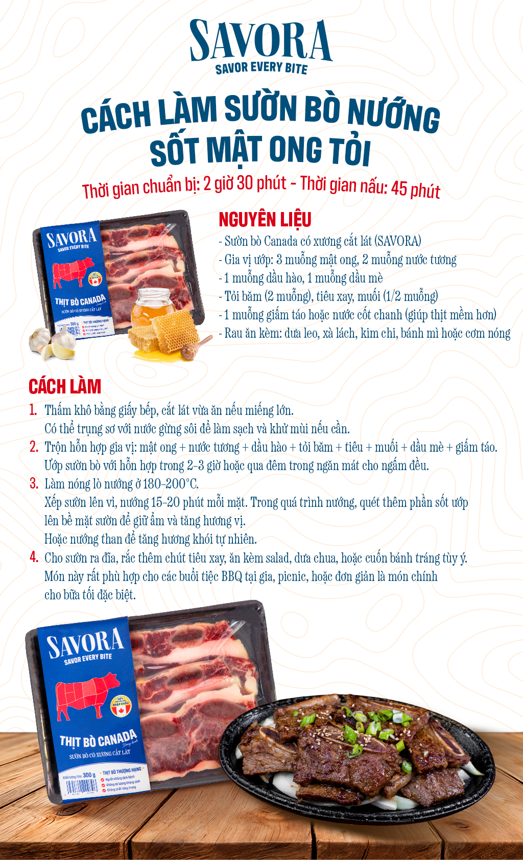 Sườn bò nướng sốt mật ong tỏi là món ăn hoàn hảo cho mọi dịp – từ bữa cơm gia đình đến tiệc nướng ngoài trời. Với nguyên liệu nhập khẩu chất lượng và công thức đơn giản dễ thực hiện, bạn hoàn toàn có thể tự tay làm nên món ăn chuẩn vị – mềm, thơm, ngọt mặn hài hòa – khiến cả nhà trầm trồ.